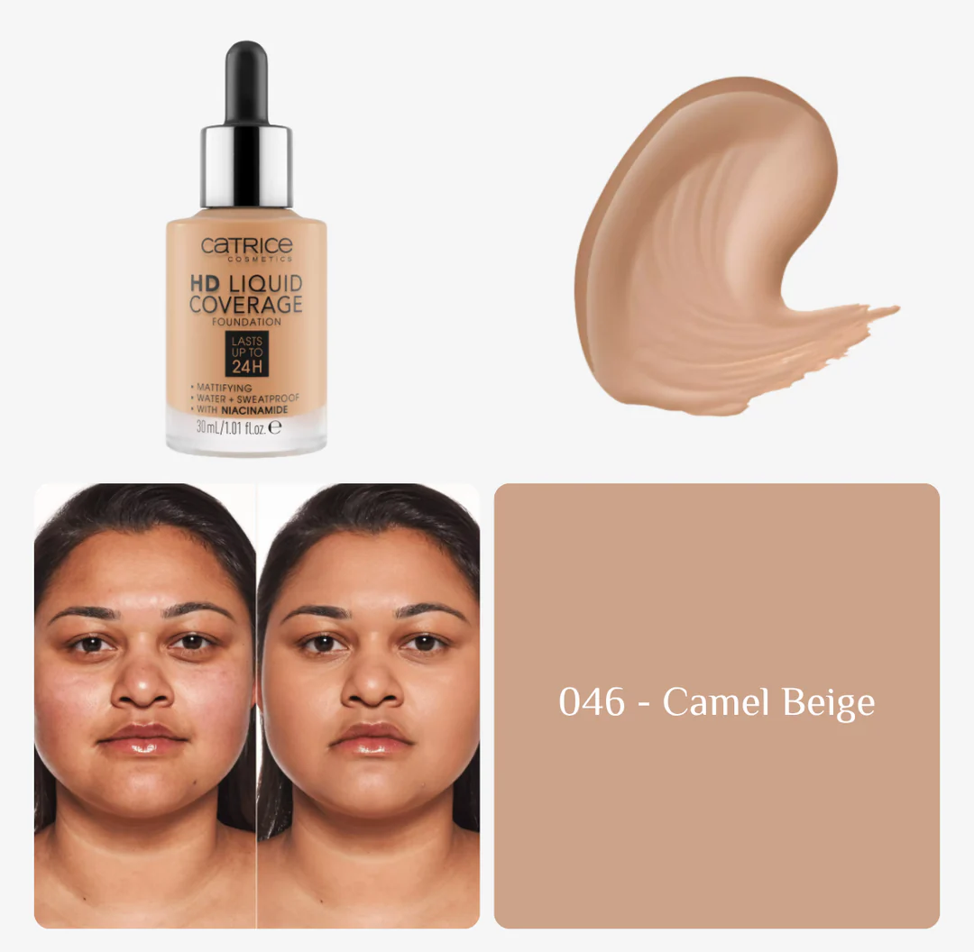 La teinte 046 du Catrice Liquid Coverage HD est une teinte moyennement foncee a sous-tons neutres, ideale pour les carnations halees ou olives qui ont besoin d’un fond de teint couvrant adapte a leur couleur de peau profonde.