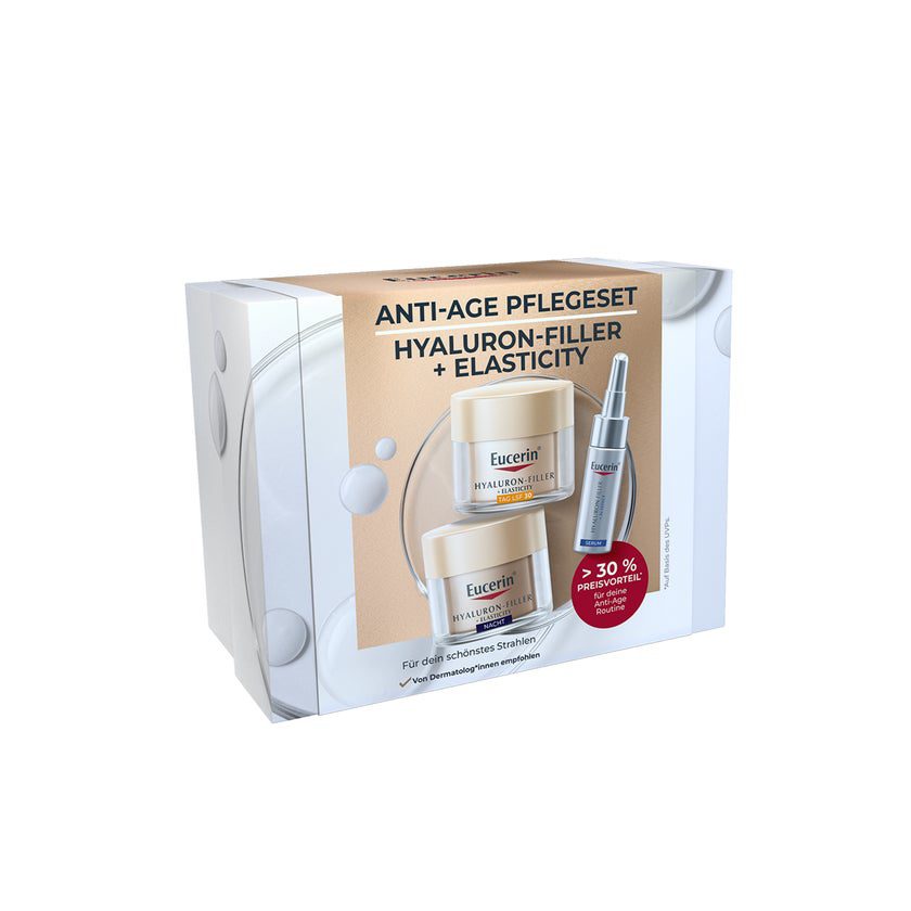 Le coffret Eucerin Hyaluron-Filler + Elasticity Jour Anti-Pigment réunit deux soins dermatologiques complémentaires pour lutter contre les rides, la perte de fermeté et les taches pigmentaires :